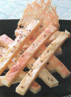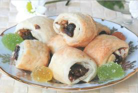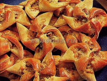 Слоённое тесто достаём из морозилки и размораживаем при комнатной температуре. Из пластов теста раскатываем и нарезаем на
