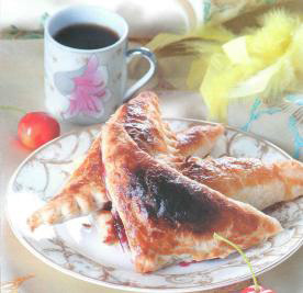 Засыпать сахаром вишню и оставить пока она не даст сок, затем сок слить. Раскатать тесто, нарезать на прямоугольники. На каждый
