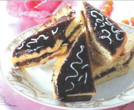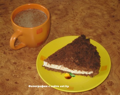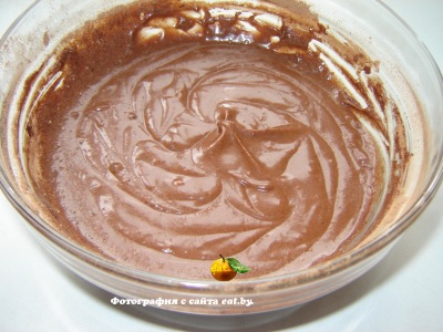Яйцо растираем с сахаром, затем добавляем растопленный шоколад и масло, муку, молоко, какао и ванильный сахар. Все это тщательно взбиваем. Тесто должно получиться как сметана