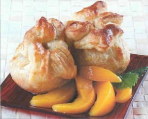 Смешать муку, маргарин, ванильный сахар, соль и яйца до получения теста и оставить на 30 минут. Промыть персики, разрезать