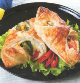 Раскатать тесто в пласт, разрезать на 4 квадрата и в серединку каждого положить обжаренные овощи, защипнуть края