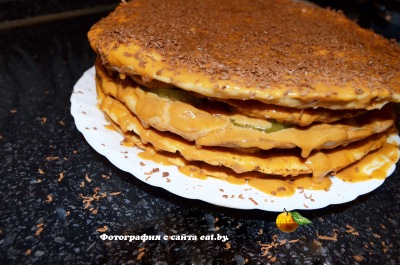 Дальше делаем крем. Для этого смешиваем вареную сгущенку с 200 г сливочного масла, хорошо взбиваем. Каждый корж смазываем кремом, сверху посыпаем натертым шоколадом. При желании