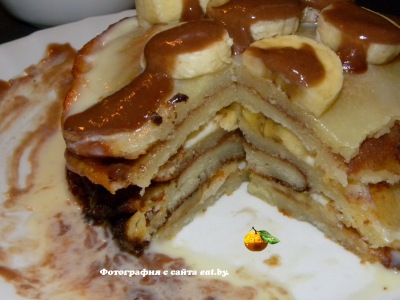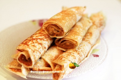 За время, пока отваривается сгущенка, делаем блины. Их лучше всего печь тоненькими и на молоке, чтобы они были не ажурными, т.е. без дырочек, иначе сгущенка может вытекать. Орехи же
