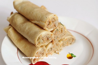 Для начинки берем уже отваренные яйца, нарезаем их небольшими кубиками. Тунец очищаем от косточек и разминаем вилкой вместе с маслом из консервы. Мелко нарезаем зелень. Теперь